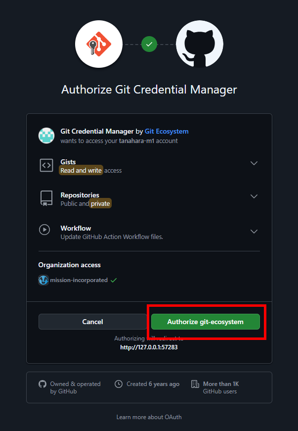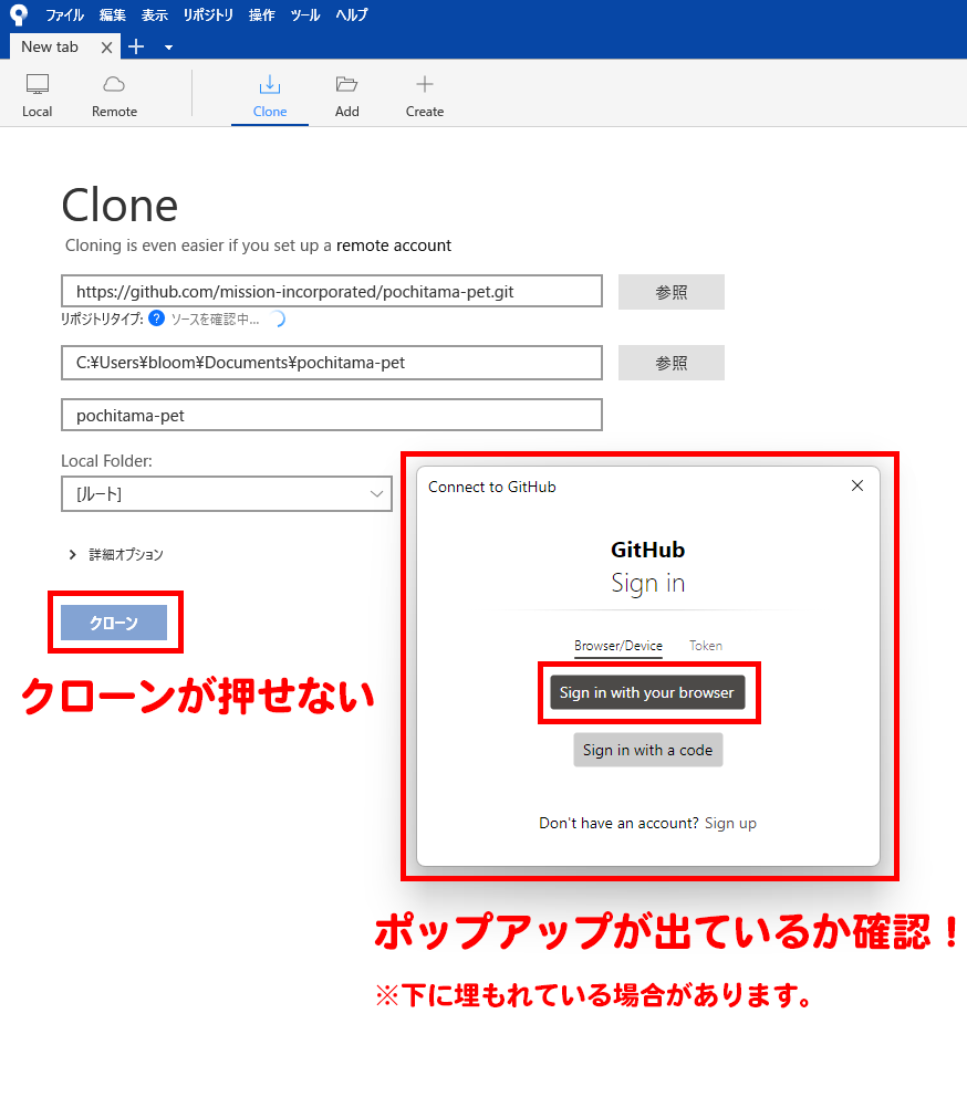 ブラウザに飛ぶので、gitで登録したメアド/パスワードを入力し、ポップアップが出るので、