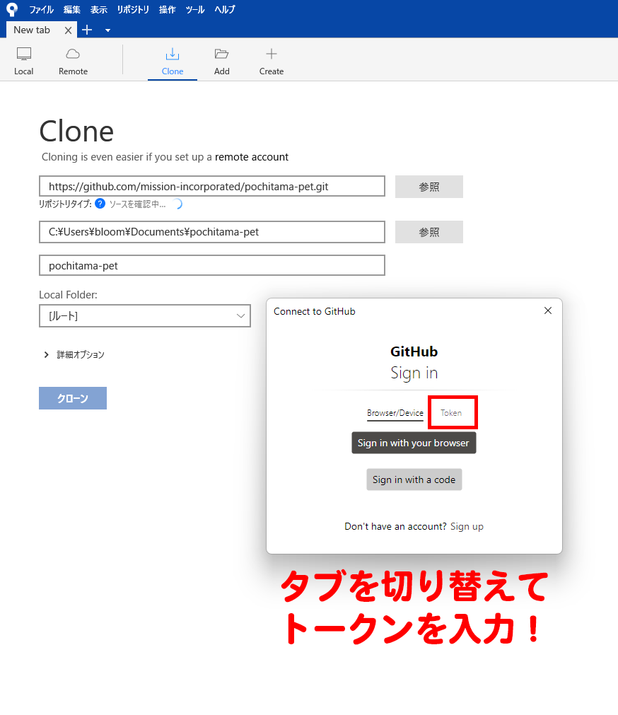 「クローン」ボタンが押せない場合、Personal access tokenが必要です。