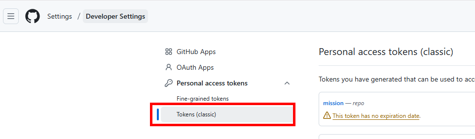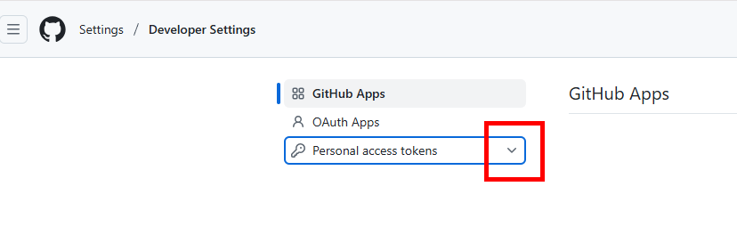 Developer setting内、左メニューの[Personal access tokens]の下矢印をクリックしてください。