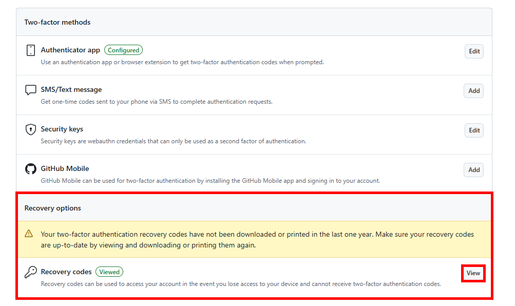 githubでは、万が一ログインできなくなってしまった時用に、[Recovery Code]が用意されています。