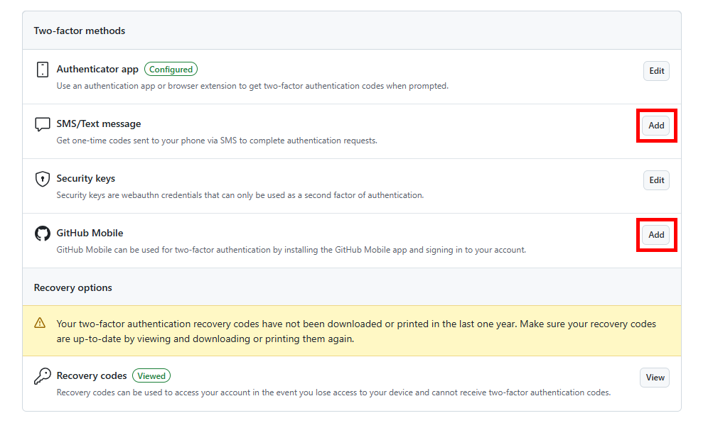また、[Settings]から[Password and authentication]の[Two-factor authentication]から任意の二段階認証を[Add]し、複数のログイン方法を持っておくことをおススメします。