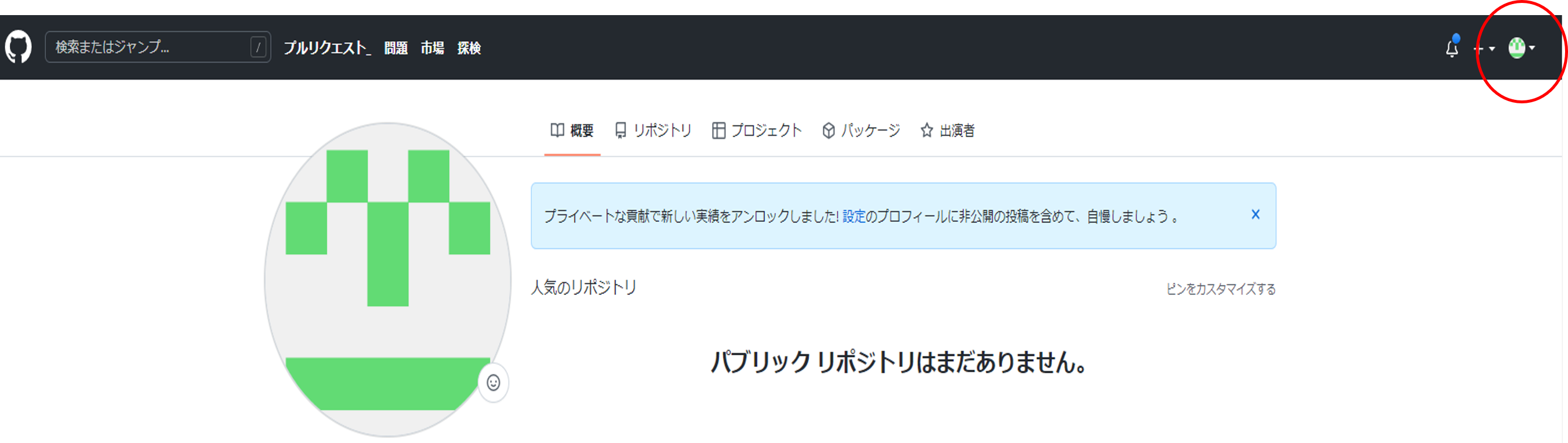 Githubへ行き、右上のアイコンマークをクリックし[Your organization]、日本語にしている場合は「あなたの組織」を選択します。