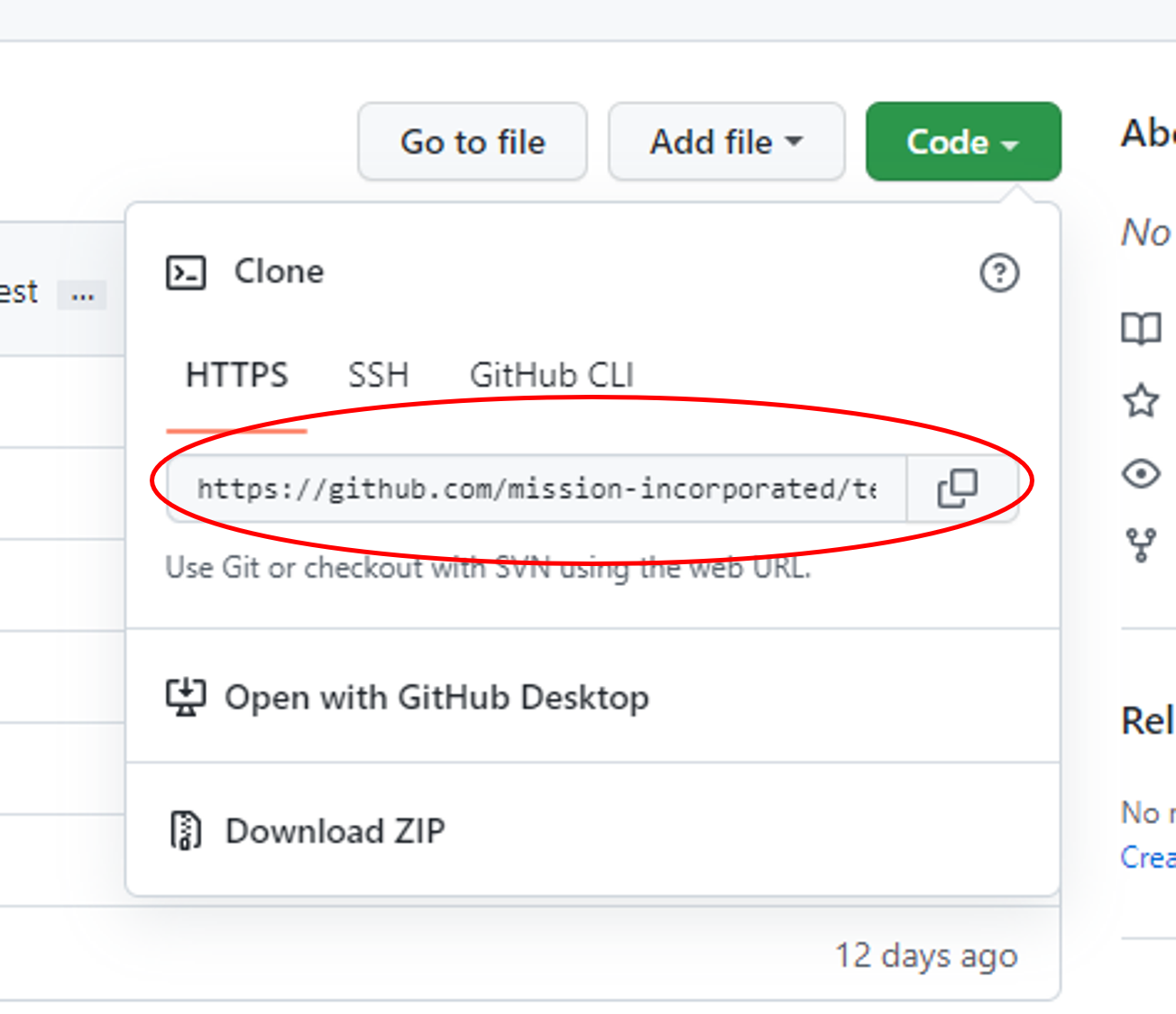 [Code]という緑背景のボタンを押し、[HTTPS]が選択されている状態で直下のURLをコピーしてきます。