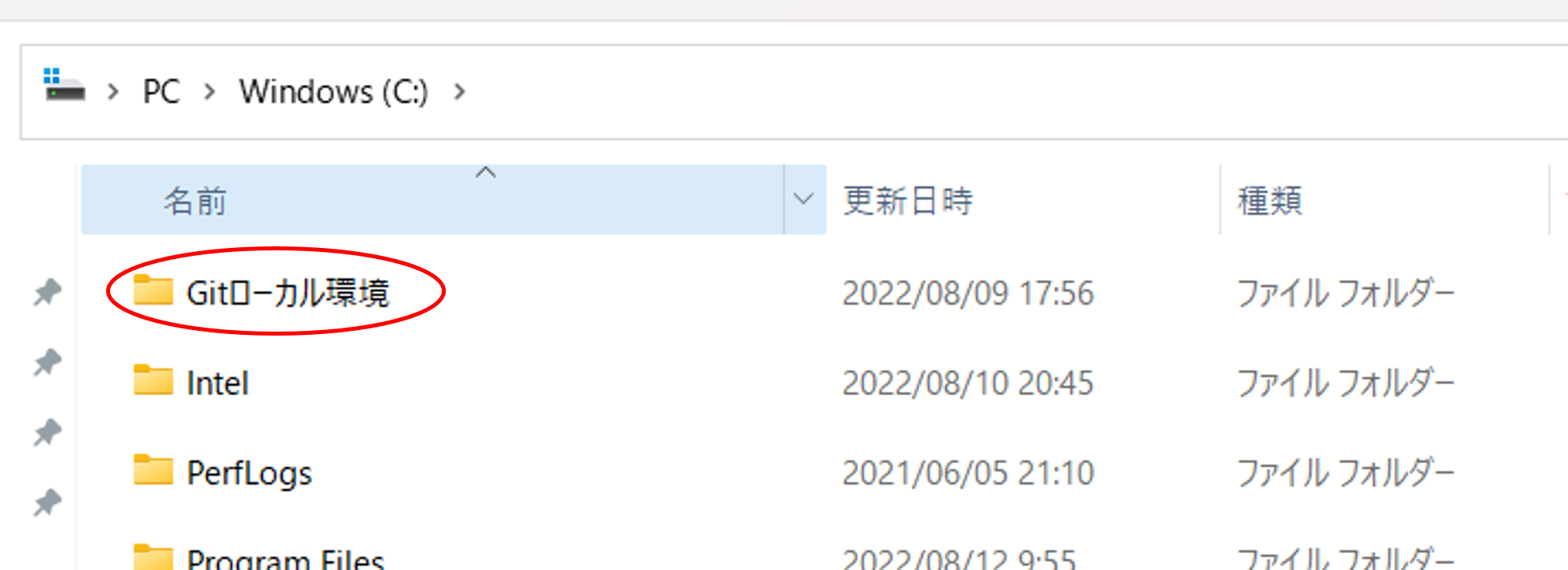 場所は任意ですが、例としてCドライブ直下に以下のようにフォルダを作成します。