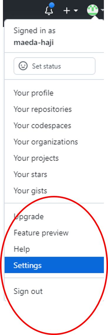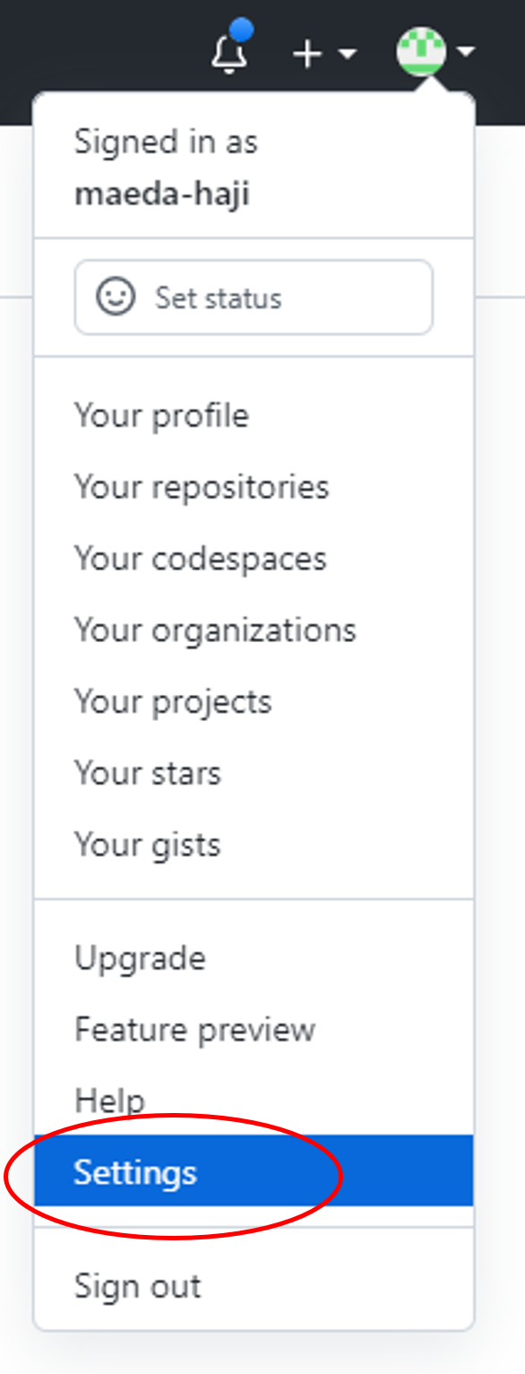 まず、Github上の右上アイコンをクリック、その中の[setting]を開きます。※日本語版では「設定」
