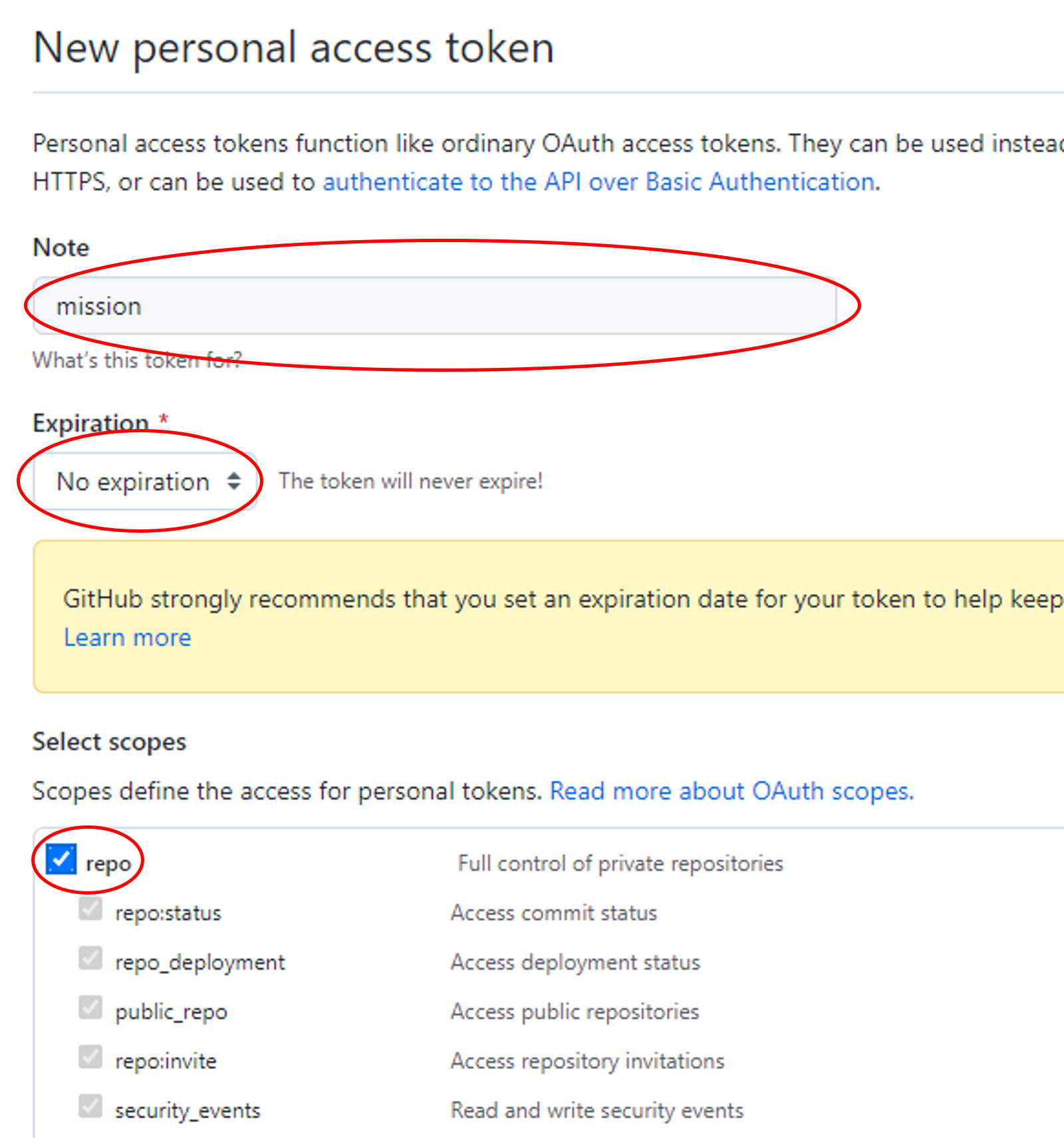 入力情報:Note ⇒ アクセストークンの名前です。任意で分かりやすい名前を付けてください。例:ぽちたまのGithub用 ⇒ pochitama