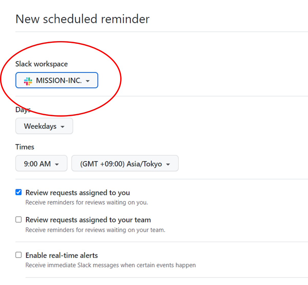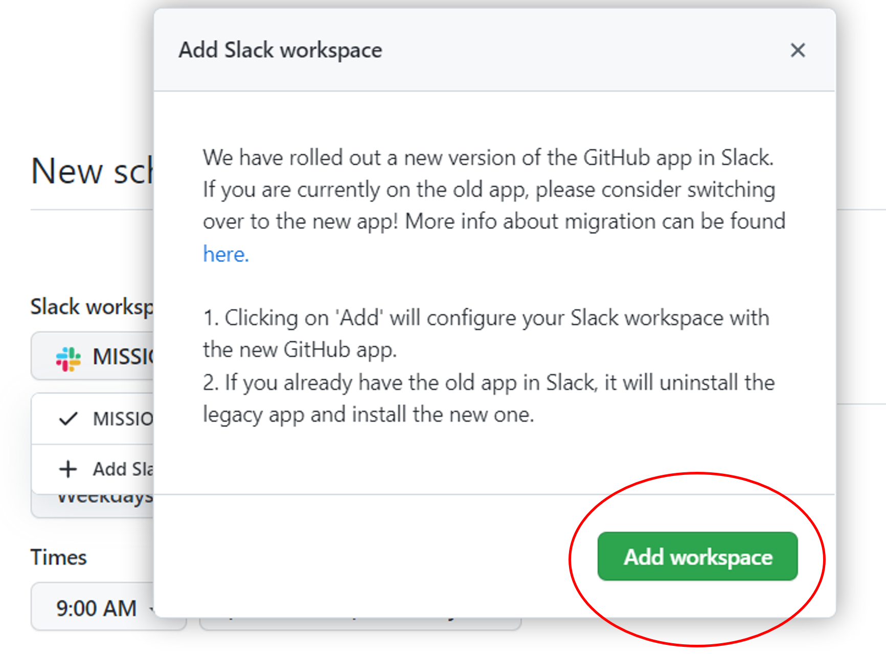 [Slack workspace]にミッションが指定されていない場合、[Add workspace]をクリックして再度連携させます。