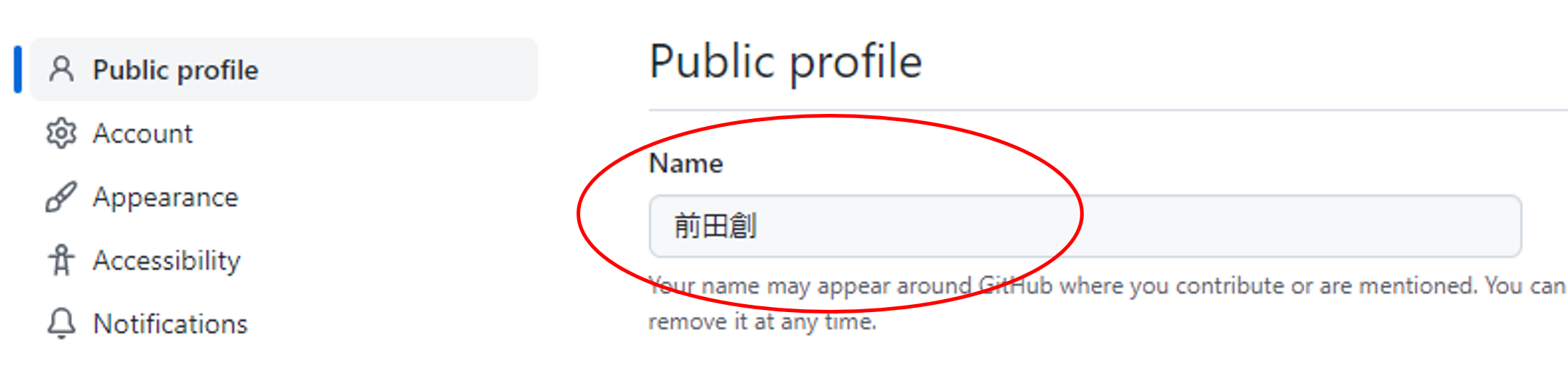 Github右上のアイコンを展開>[Settings]>[Public profile]のNameを漢字フルネームに設定してください。