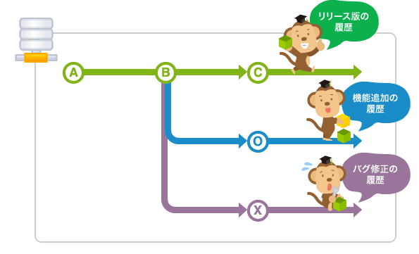 | ブランチ | 履歴の流れを分岐して記録していくためのもの。分岐したブランチはほかのブランチの影響を受けない。 |