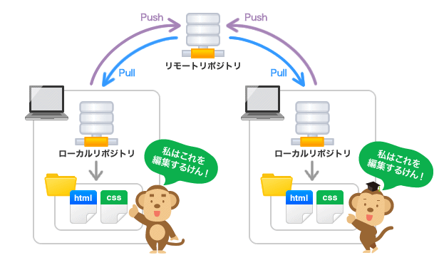 | プル(Pull) | リモートリポジトリの最新の状態を、ローカルリポジトリに反映させること。 |
