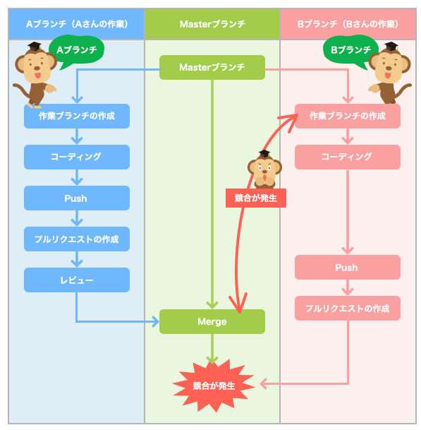 | コンフリクト(競合) | 複数人が同じ箇所を変更した場合、どの記述を優先したら良いか分からない状態。 |