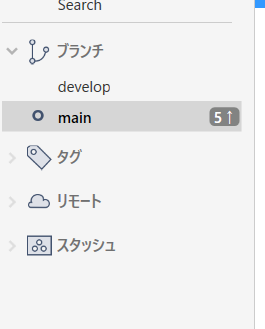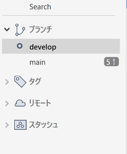 [develop]の左に〇がついている状態、これがカレントブランチなので