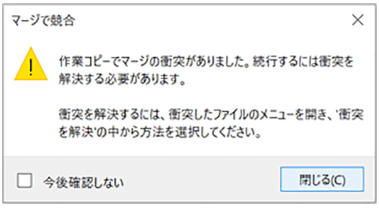 SourceTreeで以下画像のようなポップアップが出現した場合、コンフリクト解消が必要です。