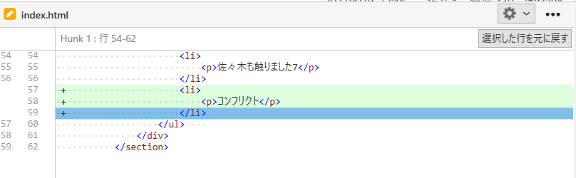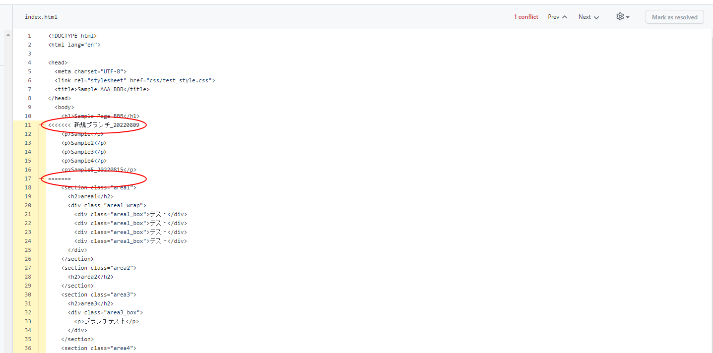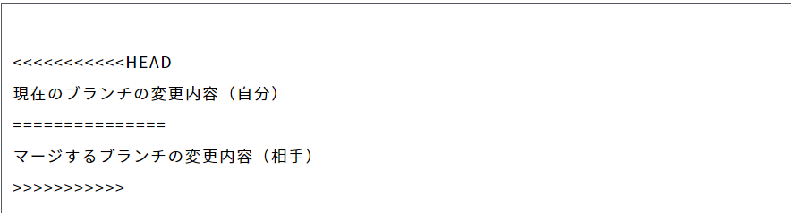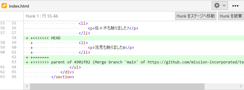 コンフリクトが起こったファイルにフォーカスすると、以下画像のような状態になっています。