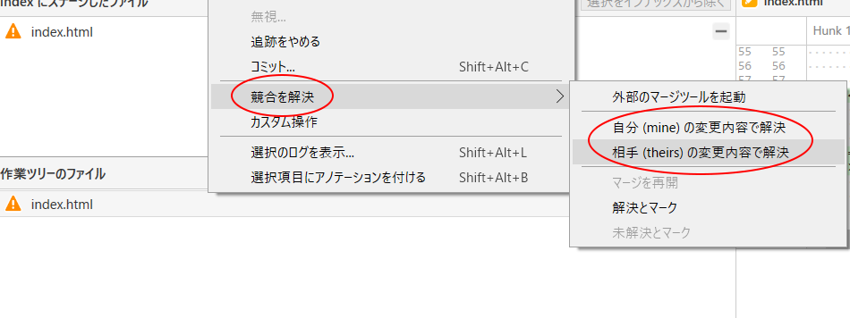 「競合を解決」>「自分の変更内容で解決」もしくは「相手の変更内容で解決」を選択します。