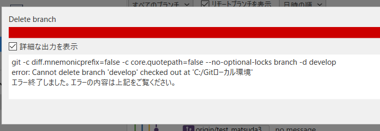 カレントブランチを削除するブランチ以外に変更してから、ブランチを削除しましょう。