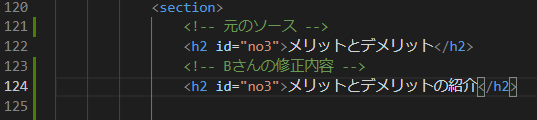 Bさんがファイル01の122行目を「メリットとデメリットの紹介」に編集しマージ