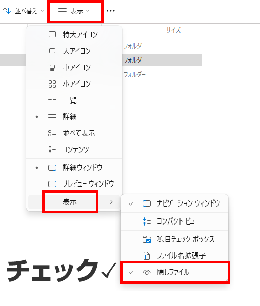 削除の対象となるファイル(起動不良の原因となっているファイル)は、隠しファイルになっています。