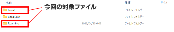 今回の対象ファイルは「Local」「Roaming」の2つです。
