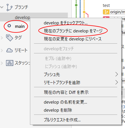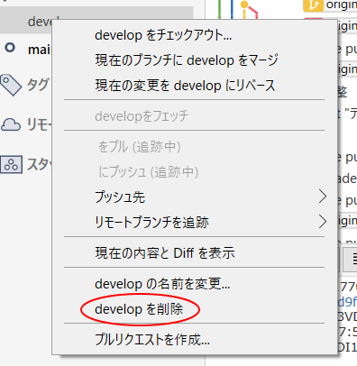 マージを実行するブランチ(今回削除したいブランチ)の上で右クリックをしてください。