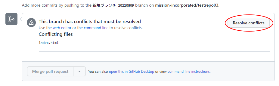 Github上でプルリクエストを作成後に以下のようなエラーが発生し、マージができない場合について解消法を説明します。